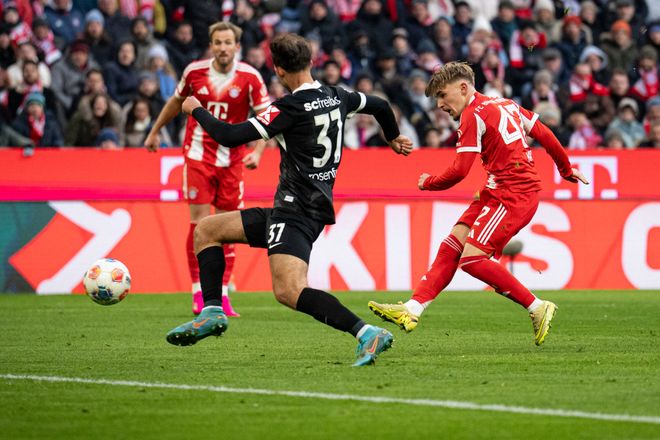 開場(chǎng)之后,拜仁眾將進(jìn)入狀態(tài)較慢,弗賴堡趁機(jī)搶得主動(dòng)權(quán)。第12分鐘,貝斯特角球傳中,金特爾腳后跟妙傳,鈴木唯人迎球掃射,洞穿諾伊爾的十指關(guān),弗賴堡打破僵局,1-0!